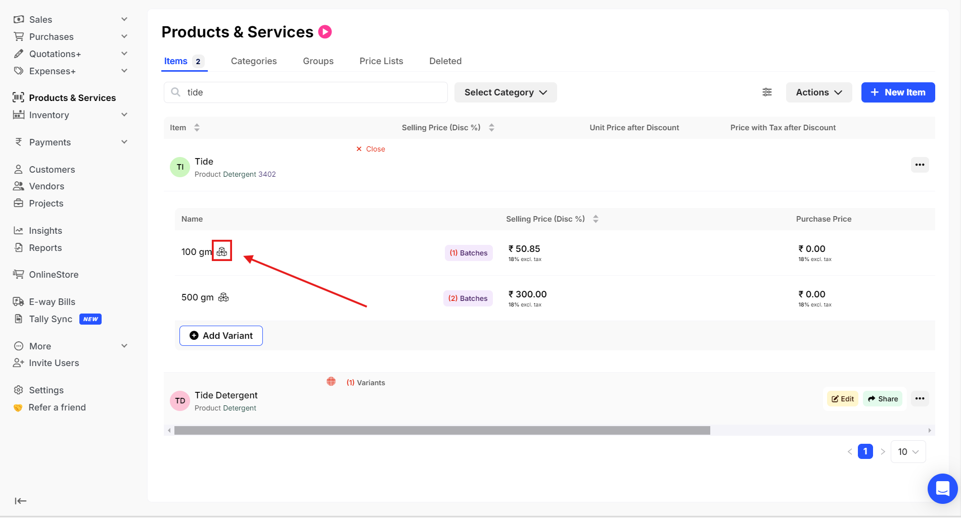 Step 7. Now you can see the products uploaded with Variants having Batches in the Products and Services section.