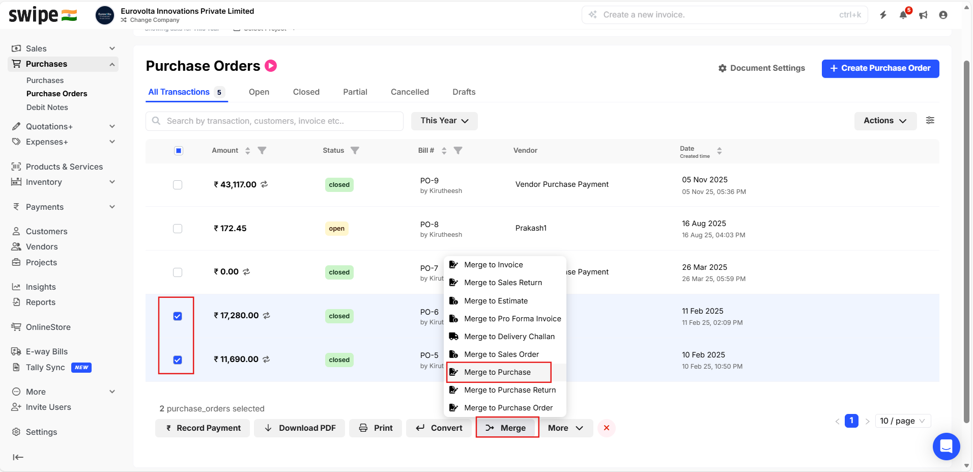 Step - 2 : Select the desired POs and click on Merge and then select the Purchase option.