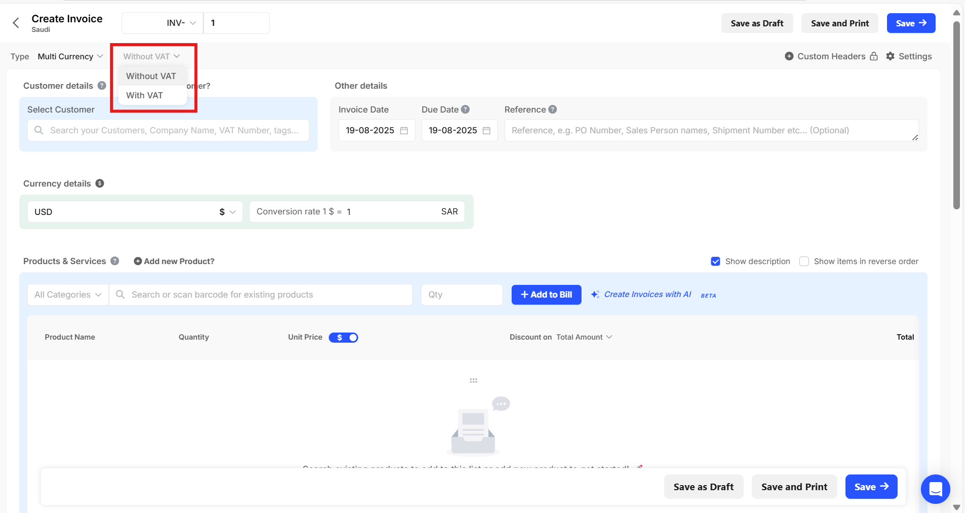 To create Multi-currency sales invoice, please follow the steps mentioned below: