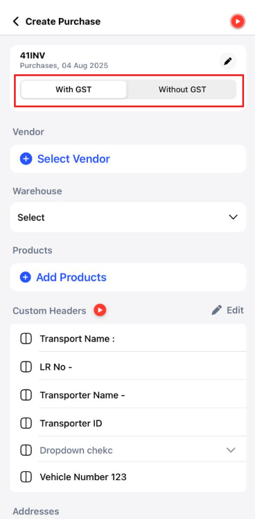 Step 2: Select, create purchase invoice “With GST” or “Without GST”.