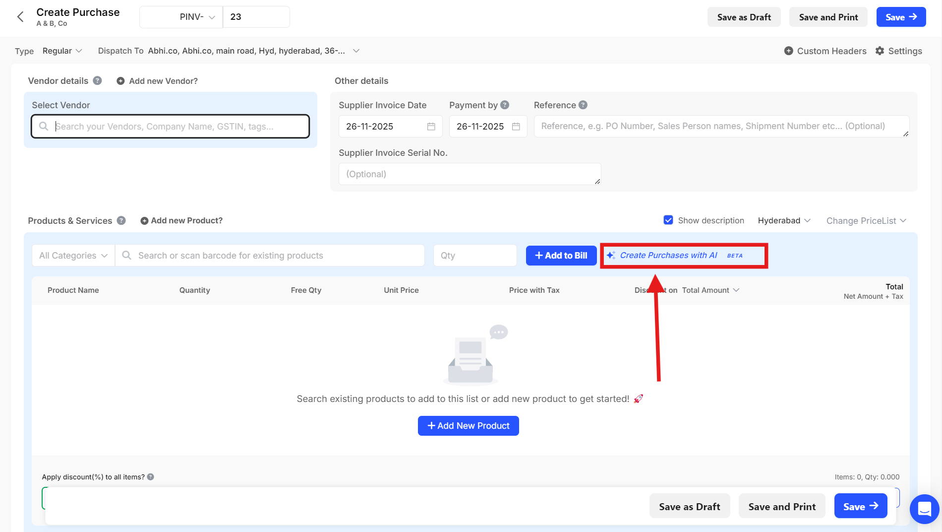 To create a purchase invoice with AI for products with batches in Swipe, please follow the below-mentioned steps.