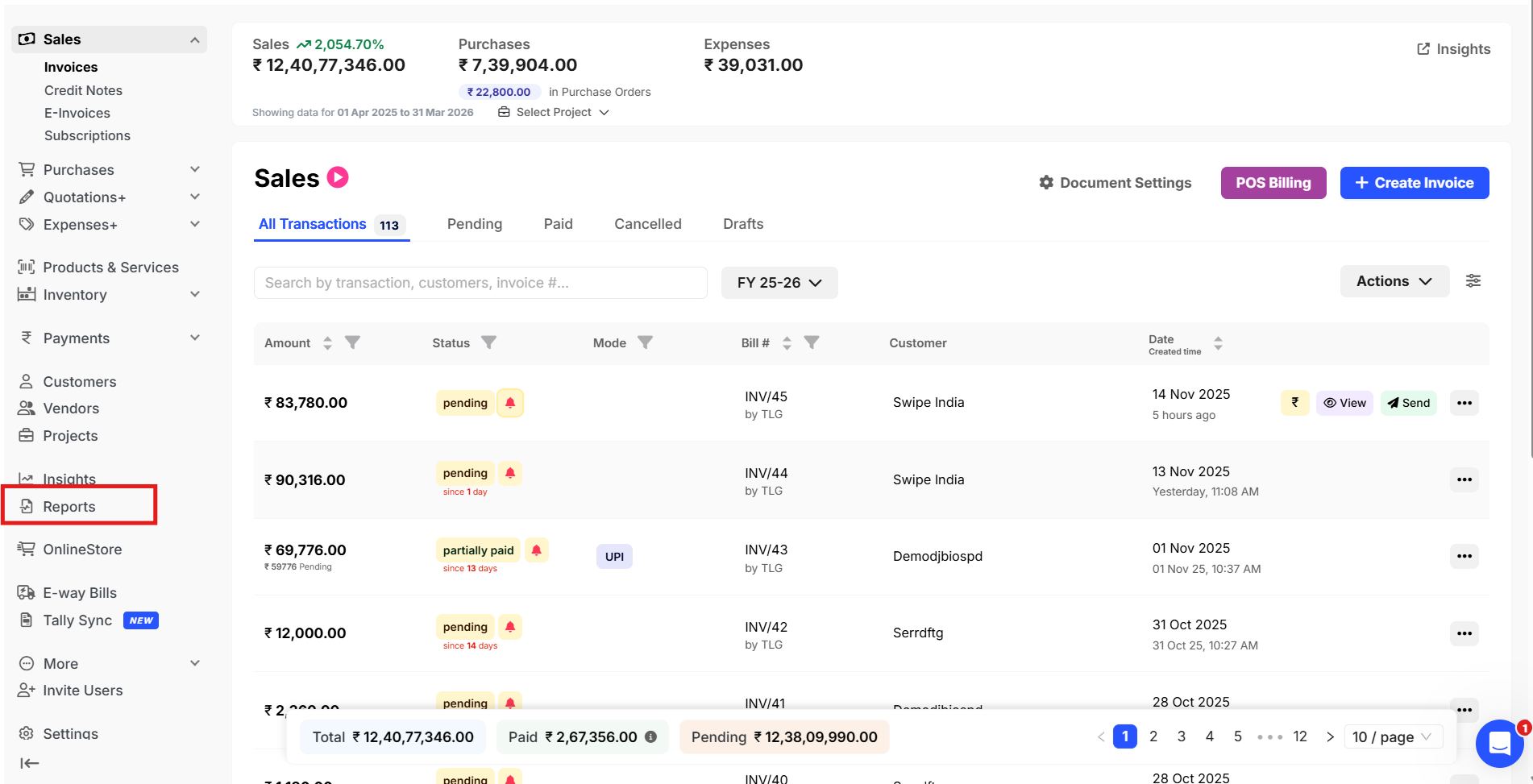 Step 2: Click on Bill- wise Item Reports and select Purchase, select the Vendor or Item, Manage columns on your requirement.