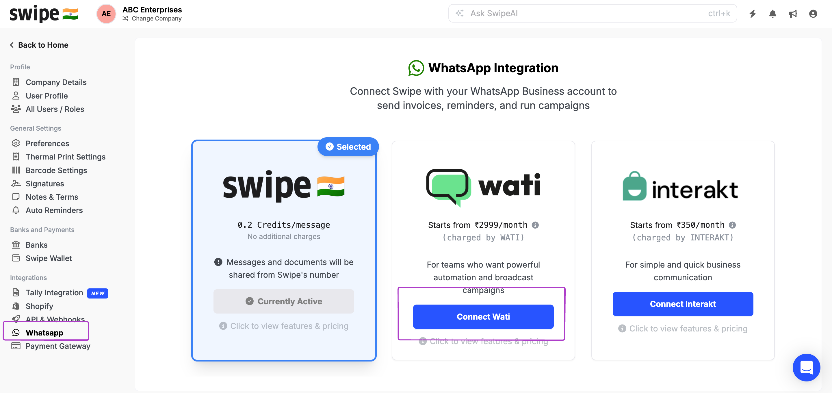Note: Swipe credits will not be deducted for sending automatic invoices post WhatsApp integration.