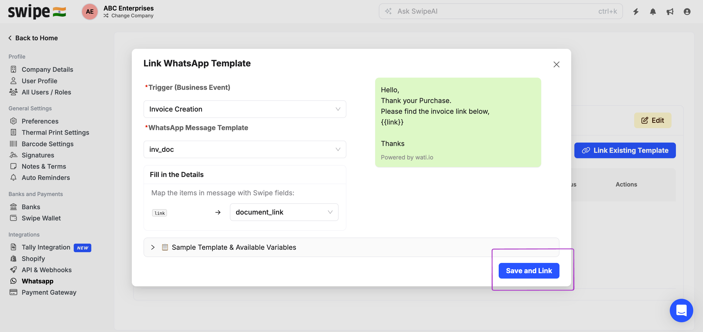 Step 5: Go back to Swipe and open Settings, then WhatsApp Integration. Click on Link Existing Templates, select Invoice Creation under the Trigger(Business Event), and choose the templates you want to link under WhatsApp Message Template for sending Invoices/reminders.