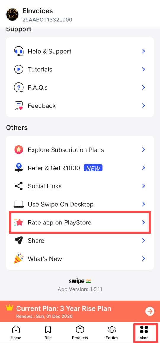 Click on More >> Scroll down and click on Rate app on PlayStore.