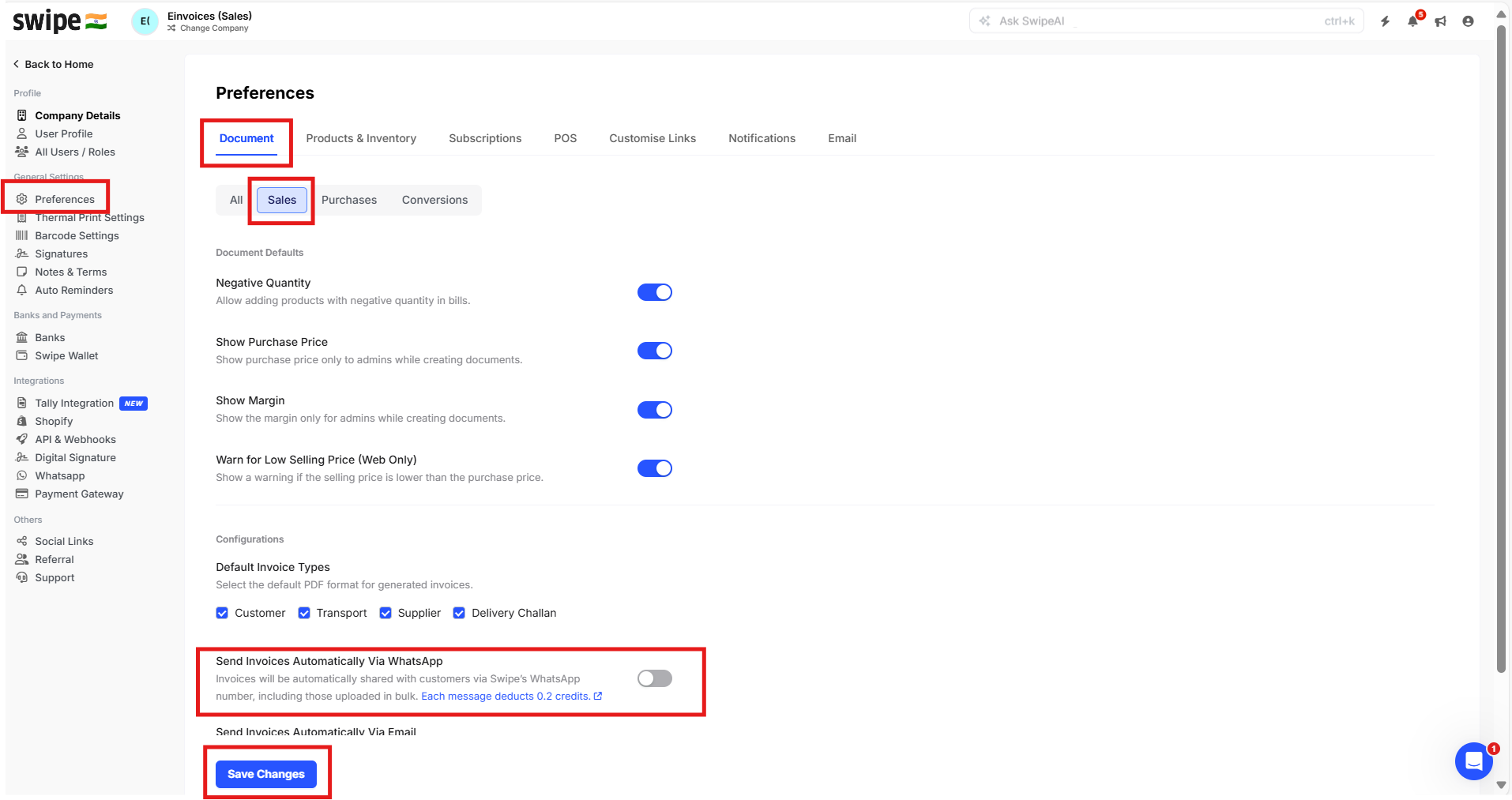 Step 2: Go to Preferences under the General Settings >> Go to Document >> Go to Sales >> Send Invoices Automatically via WhatsApp >> Disable >> Save Changes