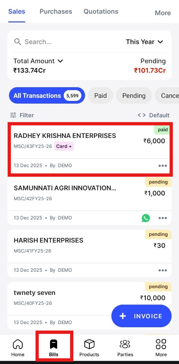 Step 1: Click on Bills, and select the invoices for which you want to see the receipts.